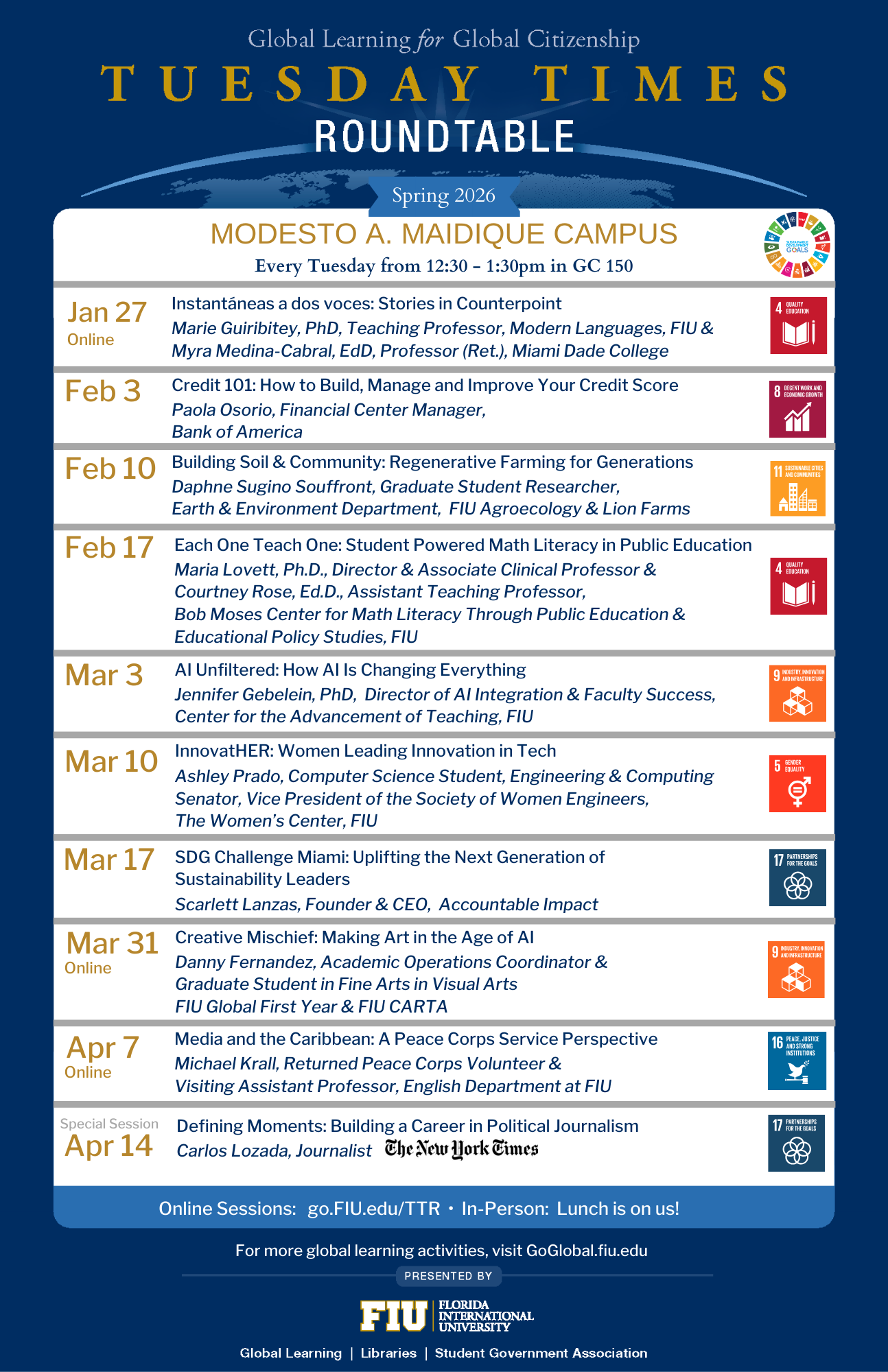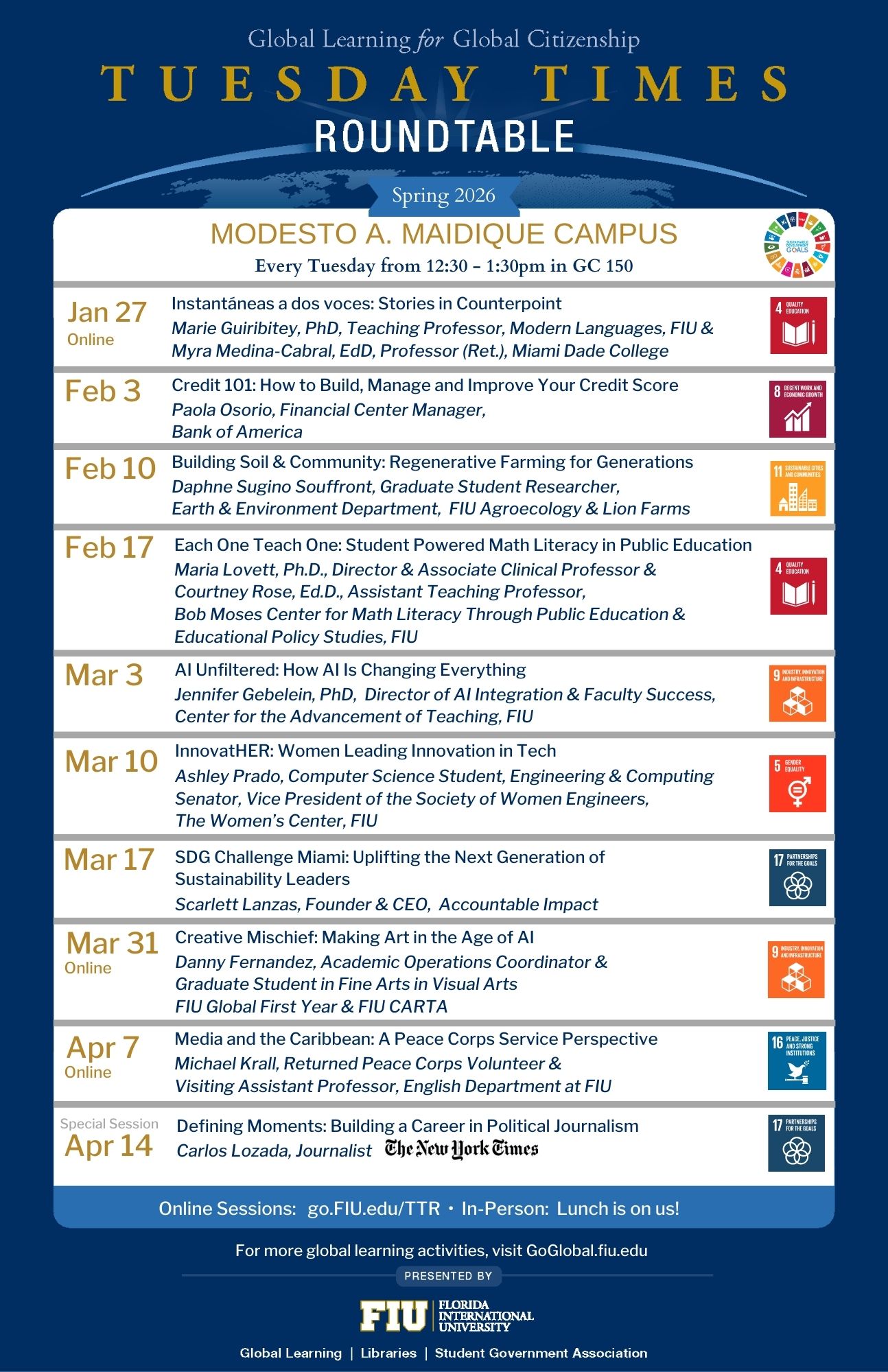 - Free Admission: TTR is open to all FIU students, faculty and staff, and there’s no cost to attend. Join us and be part of the dialogue!